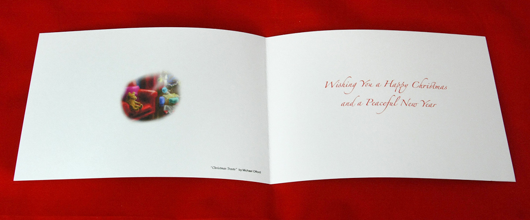 Inside: Left side, small detail from picture. Right side, message "Wishing you a happy Christmas and a peaceful new year”.
